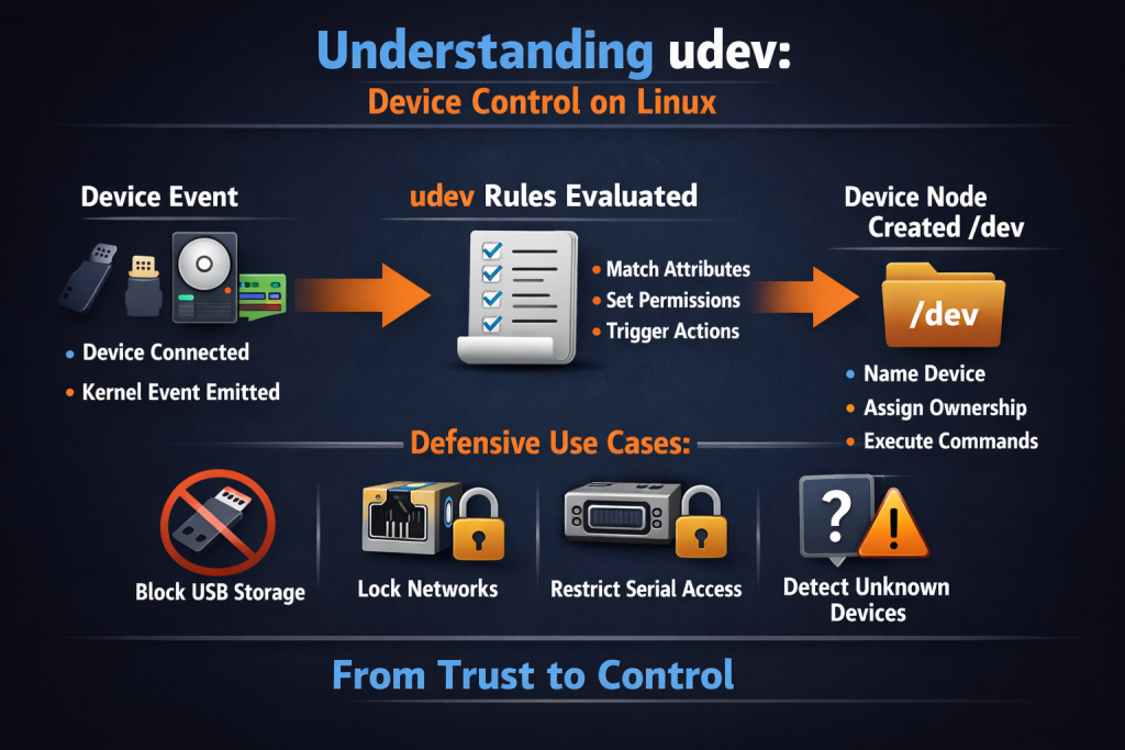 On a default Linux system, hardware shows up, gets named, gets permissions, and becomes usable with very little scrutiny. That is not magic. That is udev making decisions on your behalf.